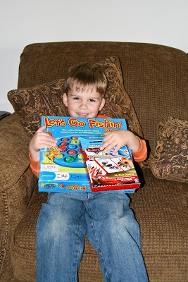 He wanted to play his fishing game right away. Too bad the kind of battery it takes was the ONLY kind of battery that mommy couldn't find. :(